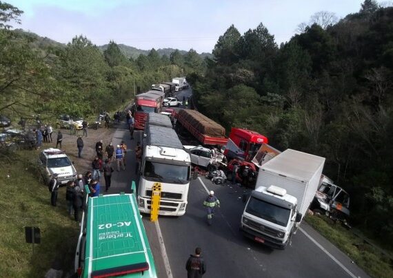 Engavetamento foi registrado seis quilômetros antes do local do acidente com o ônibus do Umuarama Futsal. Feridos foram levados ao hospital de Joinville e para o Pronto Atendimento de Garuva. Sete pessoas ficaram feridas em um engavetamento envolvendo dez veículos no km 660, BR-376, em Tijucas do Sul, no litoral...