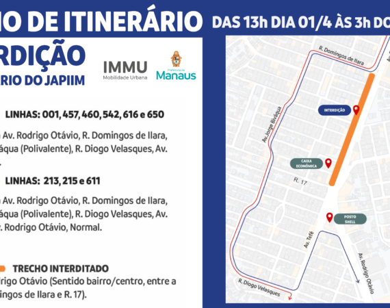 Fonte: G1 Amazonas Mudança também afeta o transporte público. Desvio ocorre neste fim de semana, para a realização da festa de aniversário do bairro Japiim. O Instituto Municipal de Mobilidade Urbana (IMMU) faz um desvio em um trecho da Avenida General Rodrigo Octávio, Zona Sul de Manaus, neste fim de semana....